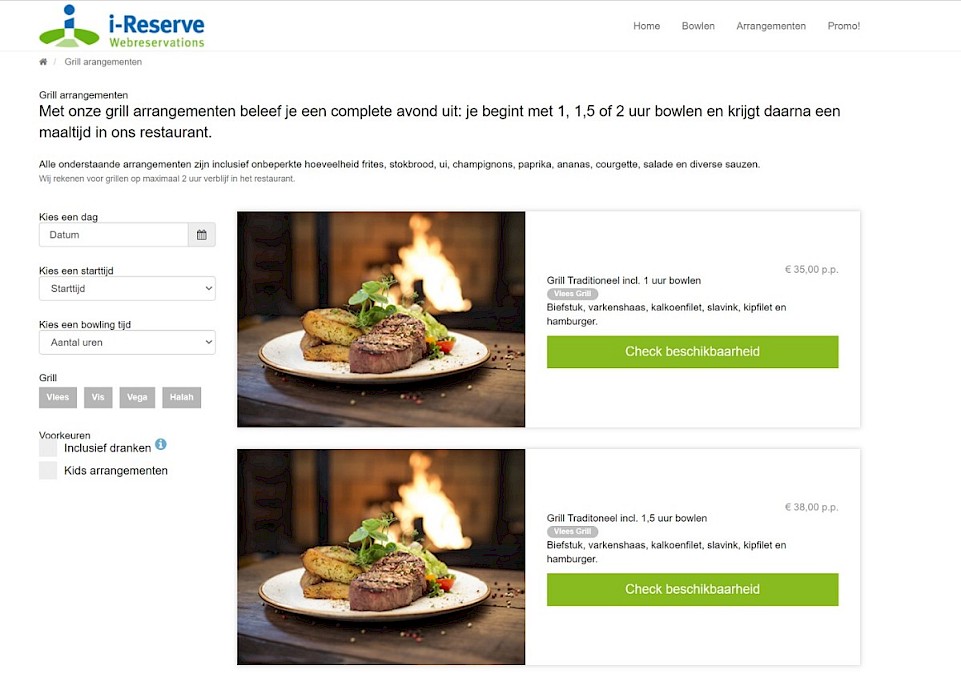 Kombinera till exempel två timmar bowling med en vegetarisk grillkväll inklusive dryck i vår demo. Precis som du kan dina kunder snabbt och enkelt välja mellan de olika tillgängliga paketen och boka utan problem.