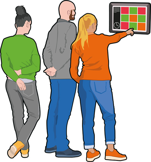 Vid ankomst kan kunderna se en skärm som visar rummets layout och vilka evenemang som äger rum var. Ingen mer förvirring, inga fler långa köer i receptionen – bara en smidig och effektiv upplevelse för dina kunder från det ögonblick de kliver in.