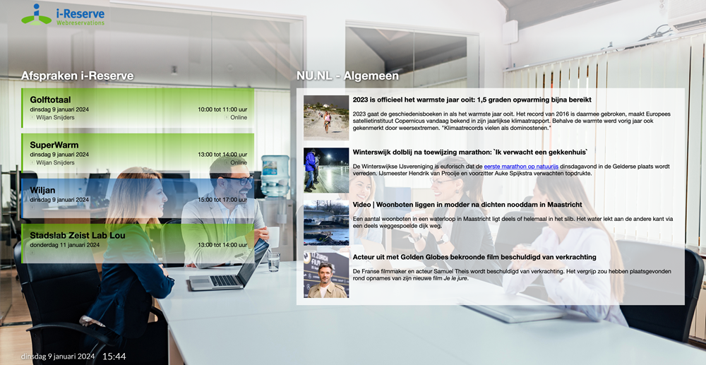 Förutom flexibiliteten och anpassningsbarheten med narrowcasting är det fina med det att det inte är begränsat till att bara visa bokningar från i-Reserve . Du kan också visa nyhetsflöden från nu.nl, aktuella väderrapporter och annan relevant information.